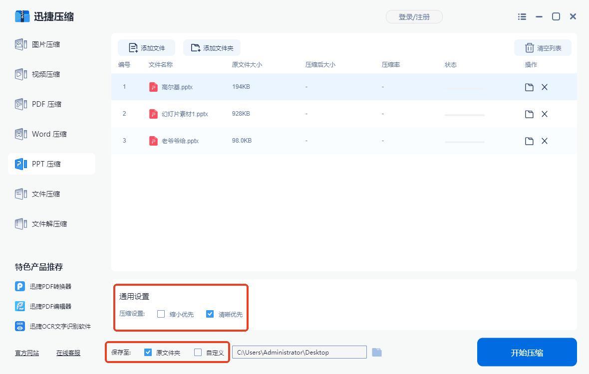 接着設置壓縮方式,軟件支持縮小優先和清晰優先,用戶可根據需求平衡畫質與體積,尤其適合處理含有大量圖片的PPT文件。