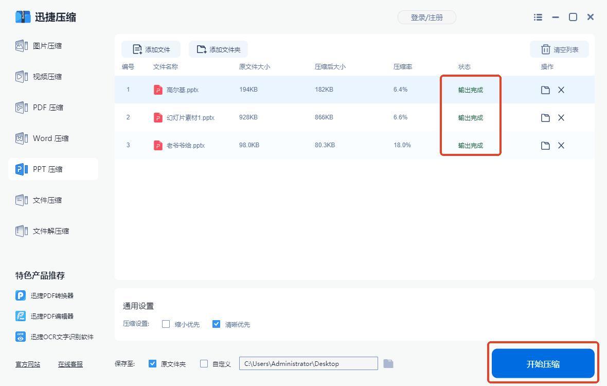 最後點擊右下角的【開始壓縮】即可得到壓縮完成的PPT,當狀態欄更改爲“輸出完成”就能得到壓縮後的PPT文檔。