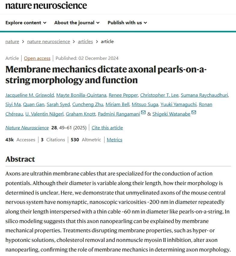 參考文獻:Griswold, J.M., Bonilla-Quintana, M., Pepper, R. et al. Membrane mechanics dictate axonal pearls-on-a-string morphology and function. Nature Neuroscience 28, 49–61 (2025).