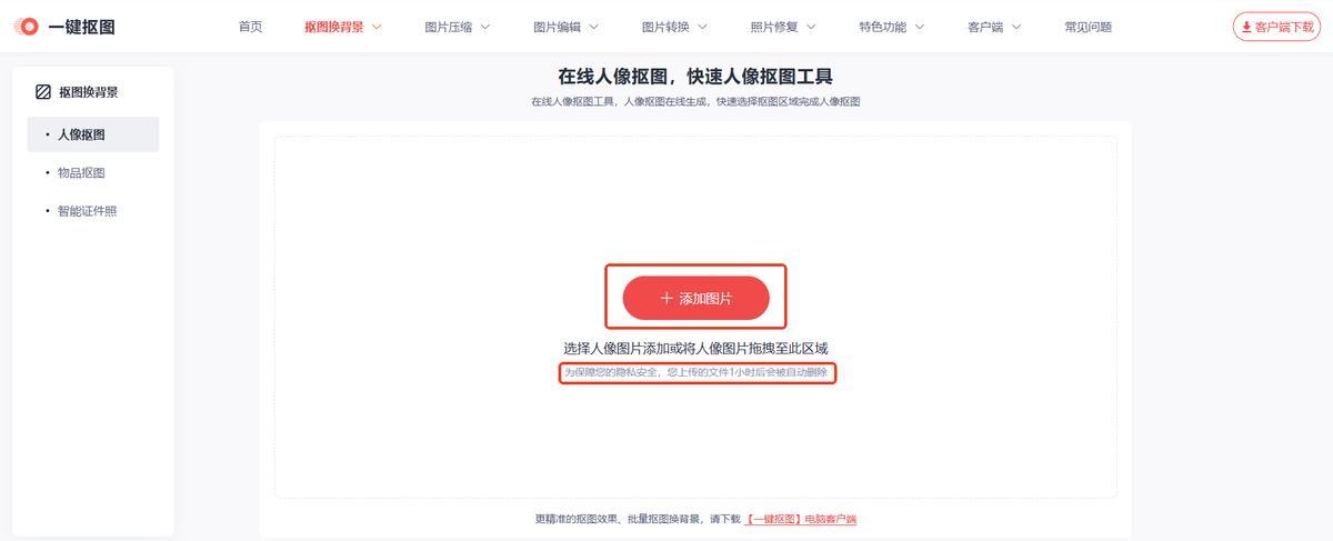 點擊【添加圖片】導入需要摳圖的照片,網站的隱私性很高,上傳的照片在1小時後會自動從服務器中刪除,提高安全性。