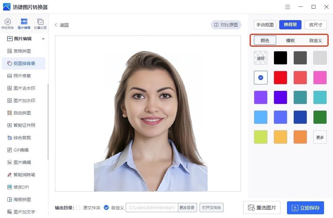 軟件自帶了豐富的背景顏色,幾乎日常需要用到的顏色這裏都有,包括藍色、白色、紅色等,還能自定義上傳照片當做背景。