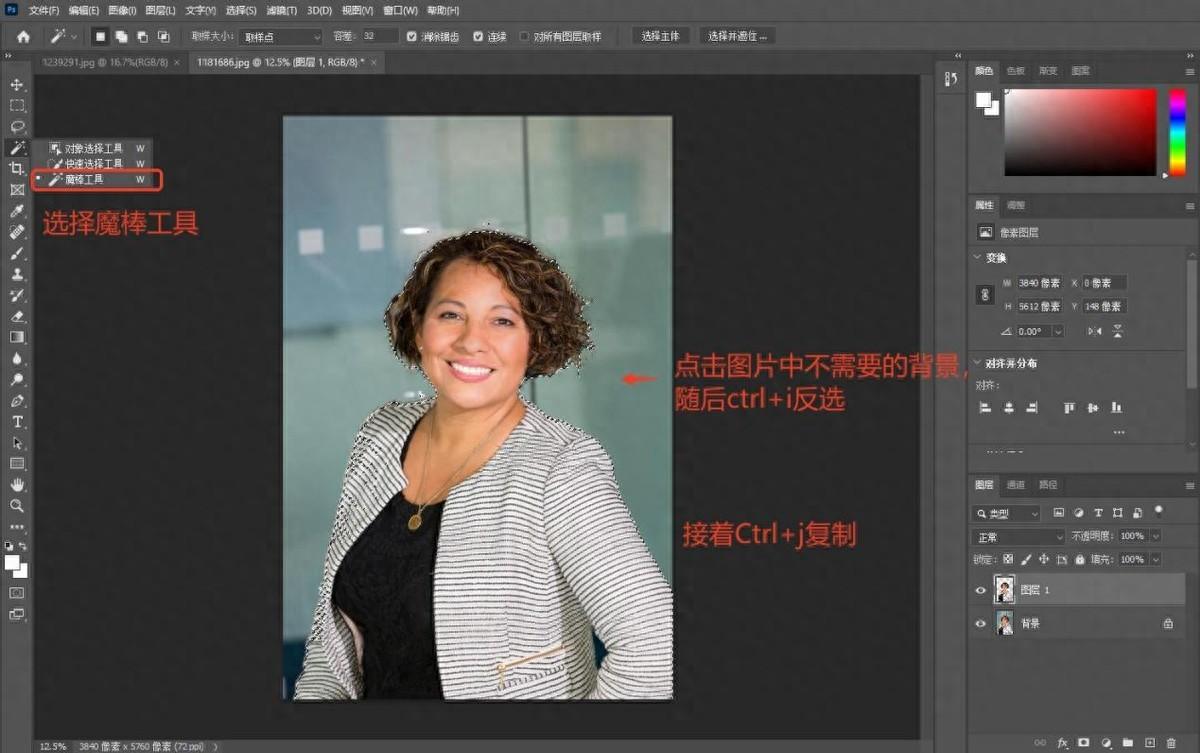 使用PS打開圖片,選擇魔棒工具,點擊圖片中不需要的背景,然後使用快捷鍵Ctrl+i反選保留人物主體,接着使用Ctrl+j複製人物。