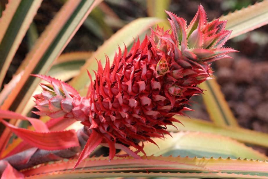 鳳梨俗稱菠蘿,是原產南美洲的熱帶水果。鳳梨的葉片像是一把把鋒利的寶劍,整體呈蓮座狀排列。花序軸從葉叢中抽出,花朵螺旋狀排列在花序軸周圍,宿存的花被片組合成鱗片狀表皮,整體呈松球狀。