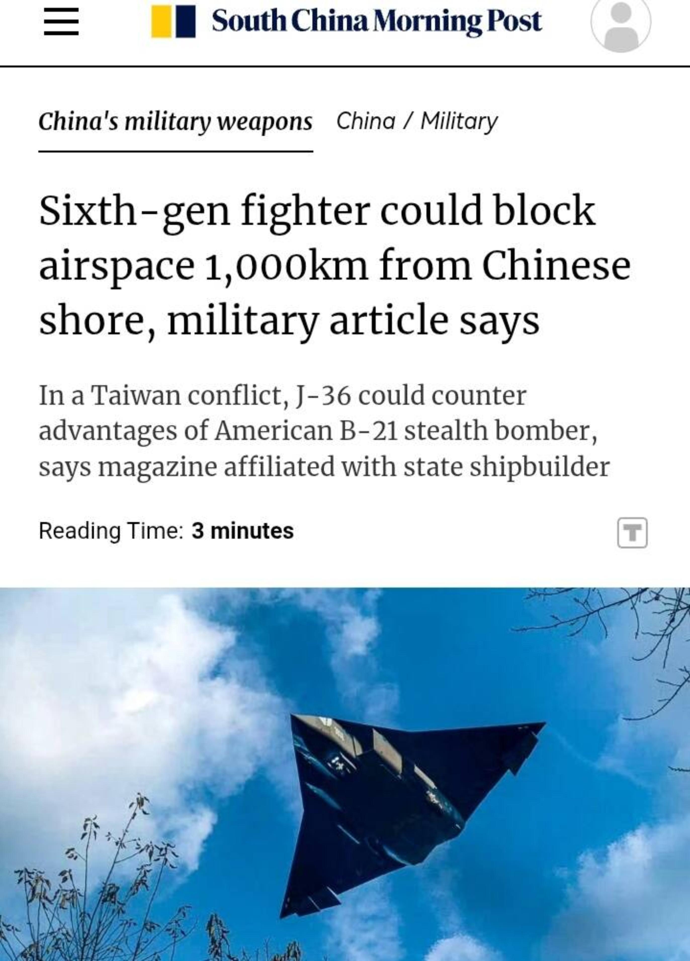 1、南華早報《第六代戰鬥機可封鎖距中國海岸1000公里的空域》