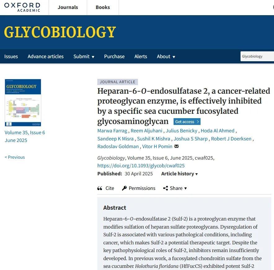 - Farrag, M., Aljuhani, R., Benicky, J., et al. (2025). Heparan-6-O-endosulfatase 2, a cancer-related proteoglycan enzyme, is effectively inhibited by a specific sea cucumber fucosylated glycosaminoglycan. Glycobiology, 35(6), cwaf025.