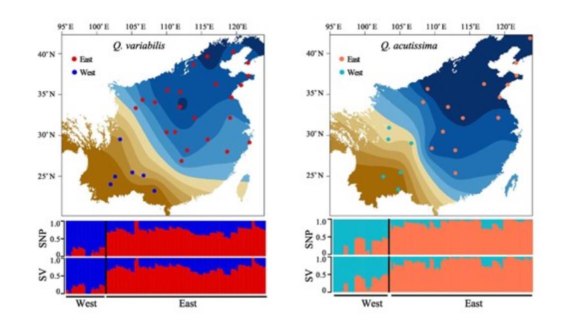 他們分析了栓皮櫟和麻櫟在不同地區的羣體遺傳數據,結果發現這兩種橡樹都存在明顯的東—西分化格局:生活在東部和西部的個體,在基因組成上有着較大的差異。就像中國南方和北方的人飲食習慣不同,橡樹的基因也隨着環境長期分化出不同的適應版本。