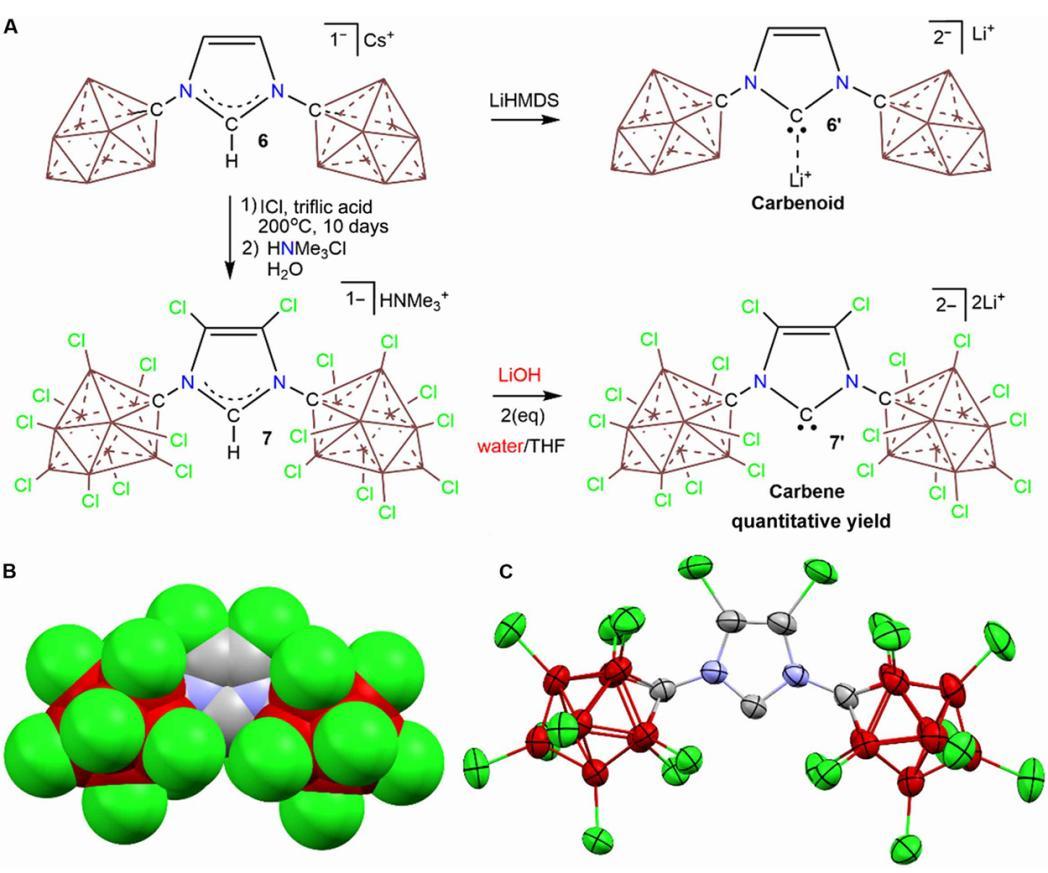 研究團隊利用功能化碳硼烷團簇作爲配體,通過全氯化策略製備了卡賓前體,並通過添加鋰雙(三甲基硅基)酰胺(LiHMDS)生成一種具有獨特 “籠子結構”的目標卡賓。這種籠狀結構通過物理阻隔的方式,爲卡賓中心提供了立體位阻保護。