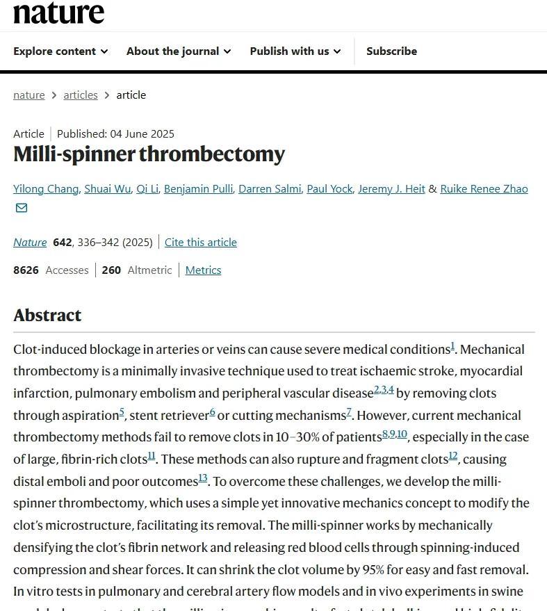 - Chang, Y., Wu, S., Li, Q., et al. Milli-spinner thrombectomy. Nature 642, 336–342 (2025). DOI: 10.1038/s41586-025-09049-0