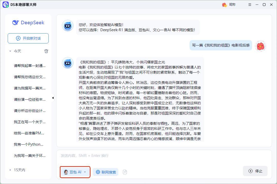 ♦.軟件支持隨時調整使用的模型,點擊下方的【deepseek-R1滿血版】,就會出現多種模型,包括快速模式、豆包、文心一言等,可以在這裏隨意切換使用中的模型。