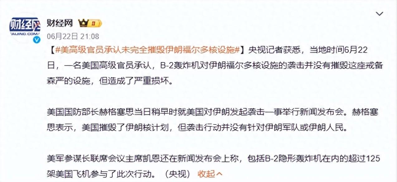 哎呀特朗普又半路開香檳,嘴上說我們贏啦,伊朗關鍵核設施已經被徹底摧毀,“福爾多已不復存在”。原以爲美國表演了個大的,結果呢,美國丟了個大的,美國高級官員承認,B-2轟炸機並沒有完全摧毀伊朗福爾多核設施。