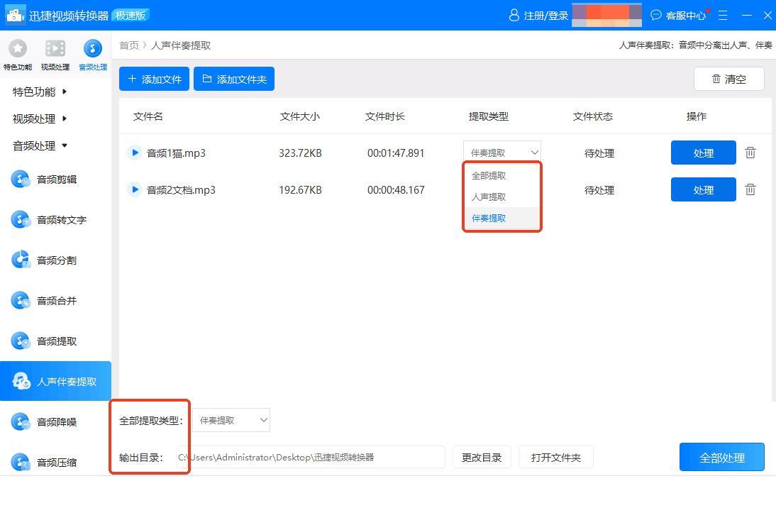 軟件可以爲單個音頻設置提取的音頻類型,只需點擊視頻中部的【提取類型】,就能自定義設置提取人聲、伴奏、全部提取;也可以在下方的【全部提取類型】爲上傳的全部音頻設置一樣的提取類型,完成後點擊【全部處理】即可快速分離成功。