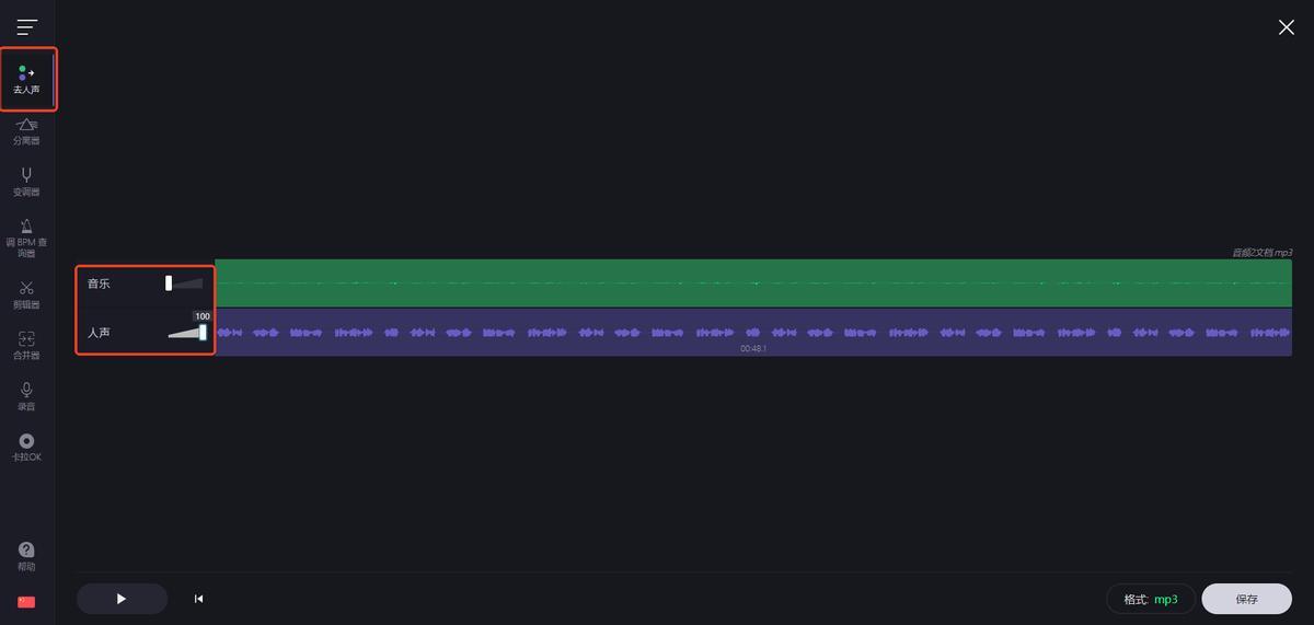 打開網站,點擊【去人聲】,導入音頻,將【音樂】左側的音量按鈕拉至0,人聲根據需求拉至合適的聲音大小,最後導出音頻即可。