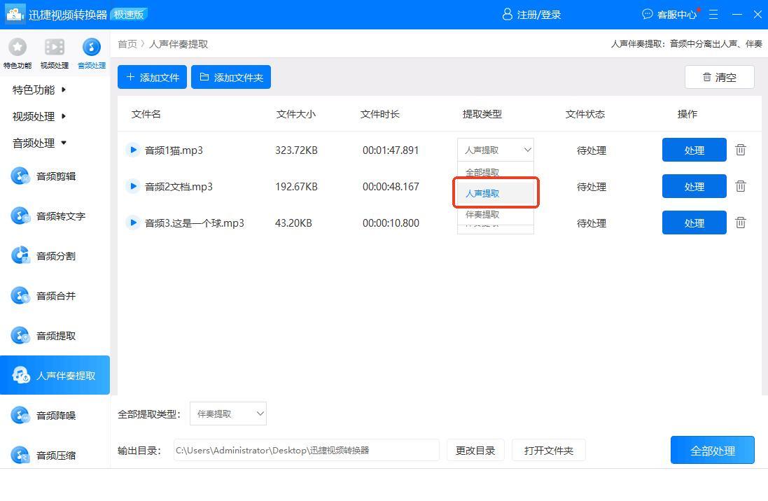 最後點擊右下角的【全部處理】即可自動提取音頻中的人聲,消除背景音樂,提取後的人聲音頻會自動保存在指定文件夾,如果沒有指定的話會自動下載在桌面,打開就能看到。