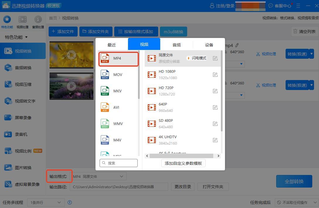 添加需要轉換的mxf視頻,軟件支持自定義設置輸出格式和輸出路徑,點擊【輸出格式】中的【視頻】,就能在下方找到MP4格式,還能選擇輸出視頻的品質。