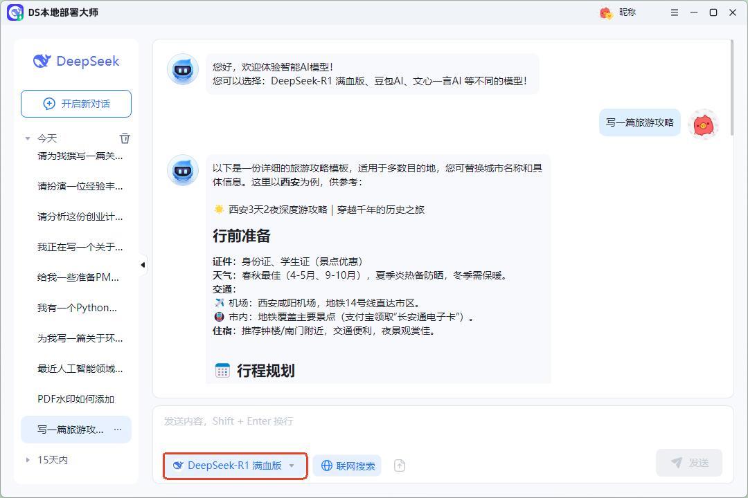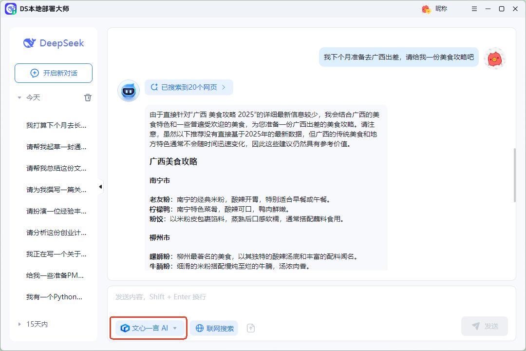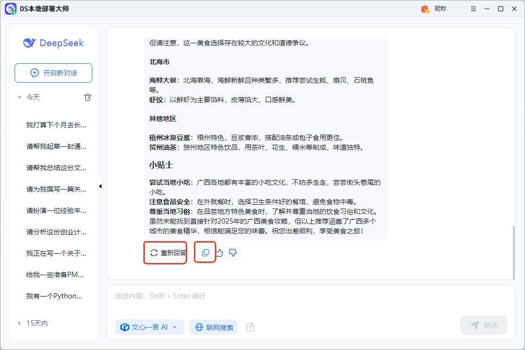 在使用deepseek模型時,可以自定義選擇聯網搜索或者本地搜索。操作也很簡單,只需要在文本框中輸入對應的問題,它就能快速的生成合適的內容。即使是聯網搜索,本地部署後軟件生成的速度也很快,無需等待很長時間。
