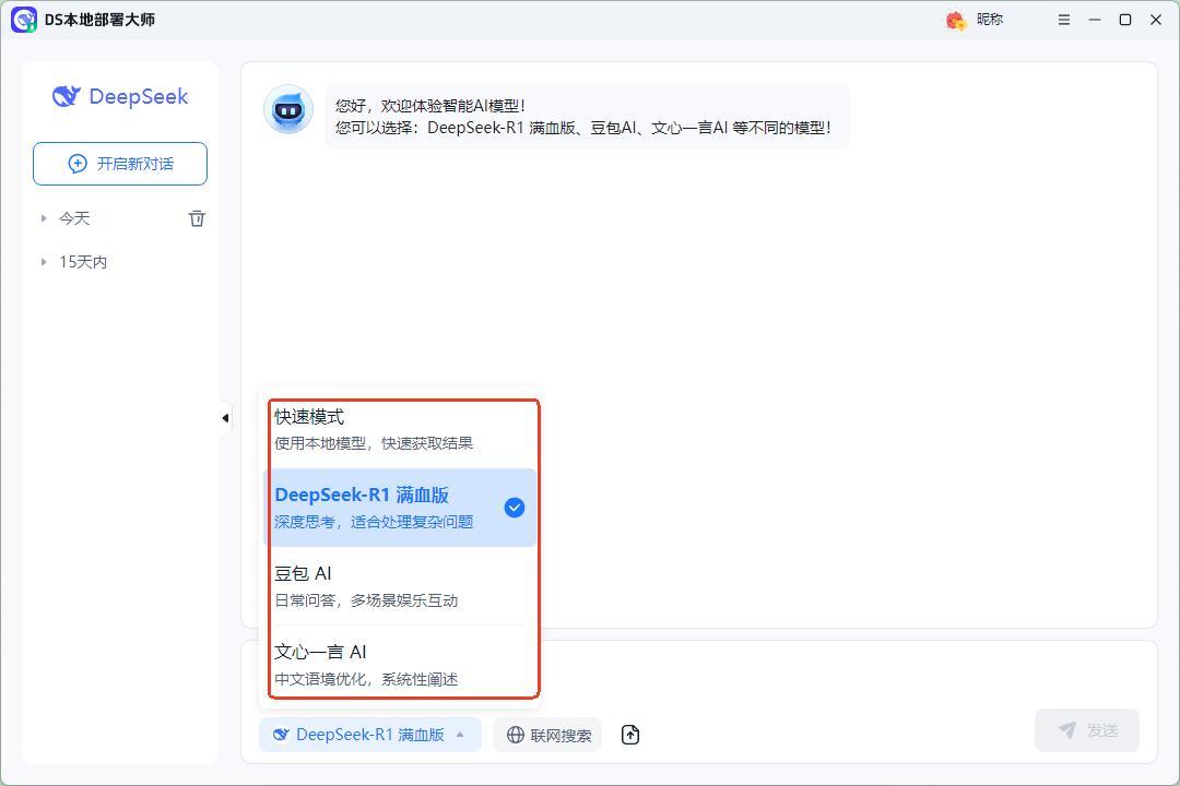 在ds本地部署大師的官網中找到下載鏈接,將軟件下載並安裝到本地,就能看到首頁了,軟件自帶deepseek、豆包等多個模型,無需複雜操作,即可一體化部署deepseek等模型並確保模型穩定運行。