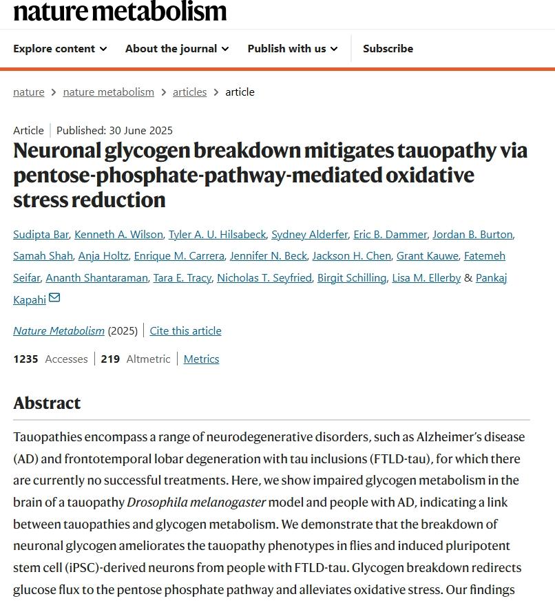 Bar, S., Wilson, K.A., Hilsabeck, T.A.U. et al. Neuronal glycogen breakdown mitigates tauopathy via pentose-phosphate-pathway-mediated oxidative stress reduction. Nature Metabolism (2025).