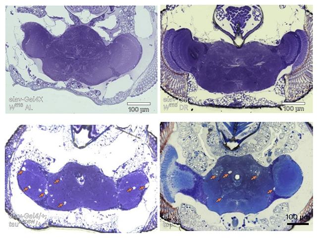 (上圖:下方爲患病果蠅大腦,可見神經元損傷(箭頭所示空泡增大))