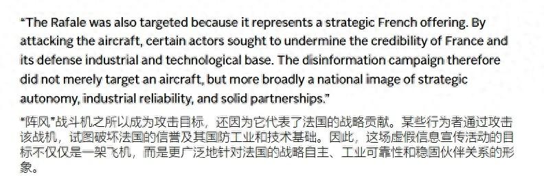 美聯社報道稱,法國軍方和情報官員抹黑說,印巴衝突之後,中國派遣人員散佈對陣風戰鬥機性能的質疑,目的是打擊法國陣風的聲譽和銷量。