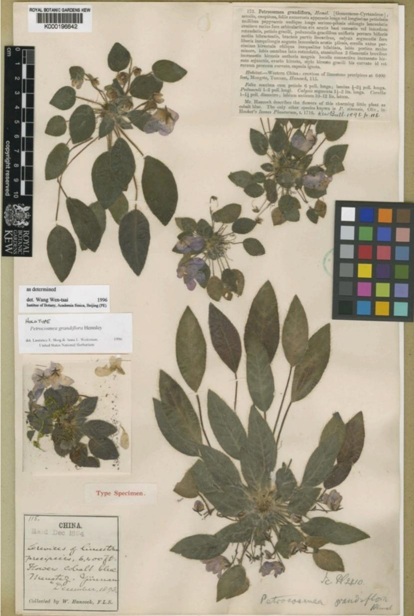 大花石蝴蝶Petrocosmea grandiflora Hemsl.,是中國特有植物,被列入《雲南省極小種羣野生植物保護名錄(2021版)》和《雲南省重點保護野生植物名錄(雲南省林業和草原局、雲南省農業農村廳公告2023年11號)》。1895年,英國植物學家威廉·漢姆斯利(William B. Hemsley)根據威廉·漢考克(William Hancock)在雲南蒙自採集的標本,將其描述爲石蝴蝶屬的一個新物種——大花石蝴蝶,標本存放於英國皇家植物園中。此後,該物種一度“消失”。