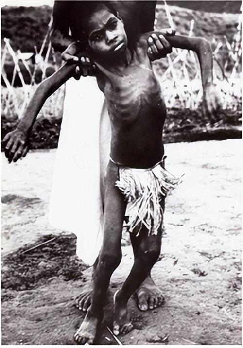 患有高級庫魯病的法雷兒童,他無法在無幫助的情況下行走、站立或坐直,並嚴重營養不良