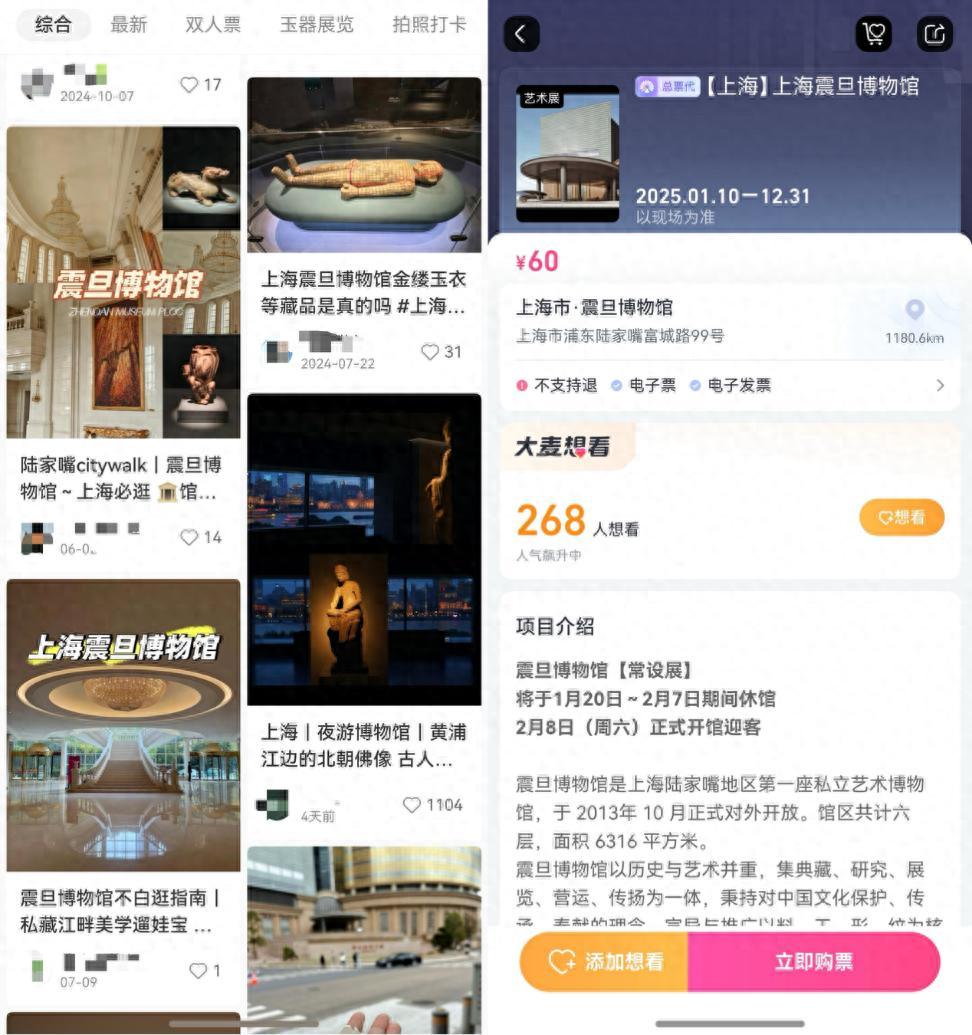 我之前在鴻蒙版小紅書上搜索博物館,一眼就被震旦博物館的展廳風格和藏品內容所吸引了。作爲國內最大的私人博物館之一,震旦博物館擁有巨大展廳的同時,還收藏着古代陶俑、歷代玉器、青花瓷器等海量藏品。在小紅書上看了些震旦博物館相關的攻略,“碰一碰”分享給了同行的好友,很快我們達成一致、選好日期。朋友還推薦我用大麥的元服務買了票,這樣就不用擔心現場沒票了。