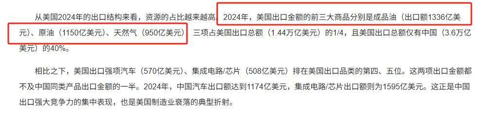 第二大殺招:聲東擊西。別看美國現在是世界霸主,但是已經快淪落到賣資源的了,2024年美國出口金額前三大商品分別是: 成品油(出口額1336億美元)、原油(1150億美元)、天然氣(950億美元),三項佔美國出口總額(1.44萬億美元)的1/4。相比之下,美國傳統出口強項汽車(570億美元)、芯片(508億美元)排在美國出口品類的第四、五位。而且這兩項出口金額還不及中國同類產品出口額的一半。