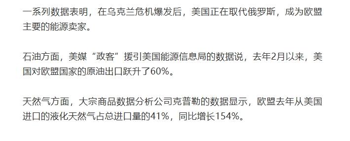 你發現什麼沒有,沒錯,那就是美國和俄羅斯是競爭關係,美國瘋狂打壓制裁俄羅斯油氣的原因,表面上看是要斷了俄羅斯財政收入,實際上,它想取而代之。比如:北溪管道被炸後,歐洲對俄氣依賴從40%降至不足10%,2023,美國對歐洲石油出口量激增154%。