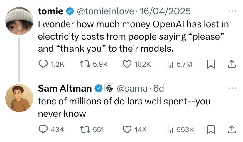 怪不得前不久奧爾特曼說,千萬別對AI說謝謝、對不起了,因爲它們回答你要浪費巨大的電力。