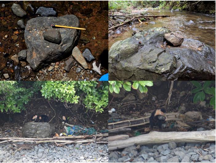 (a)置於石砧上的錘石;(b)位於河牀上的石砧及其上的石錘、和周圍的棕櫚果碎片;(c)成年雄性白臉捲尾猴雄尾猴正在用錘石在石砧上加工食物,而同種動物則專心地觀察;(d)在海岸上,成年雄尾猴在木砧上用錘石加工不明食物。