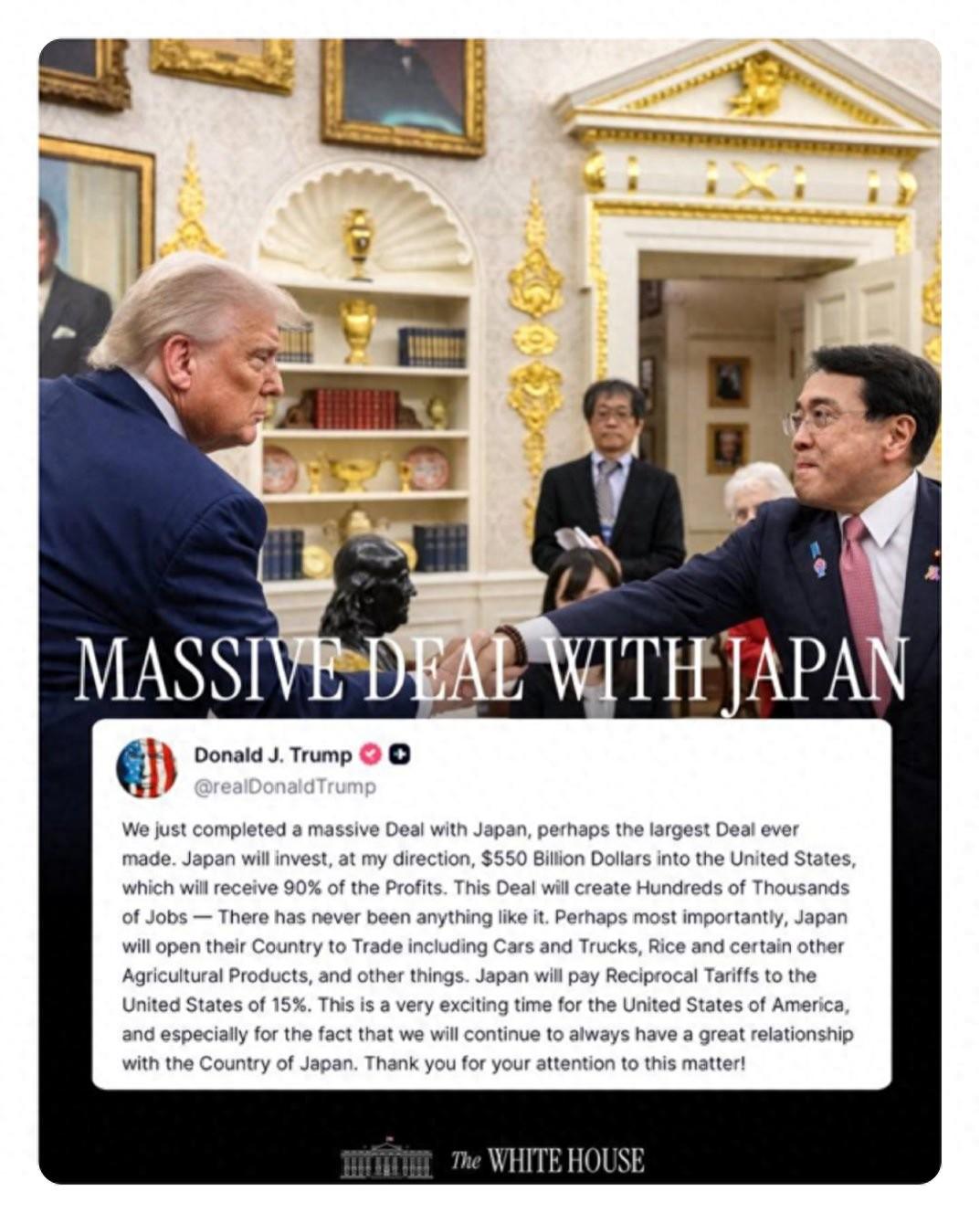 特朗普又贏了,特朗普發文表示美國與日本達成貿易協議,原定於25%的對等關稅將下調到15%,日本將開放農產品市場,並向美國投資5500億美元,美國將獲得其中90%的利潤。