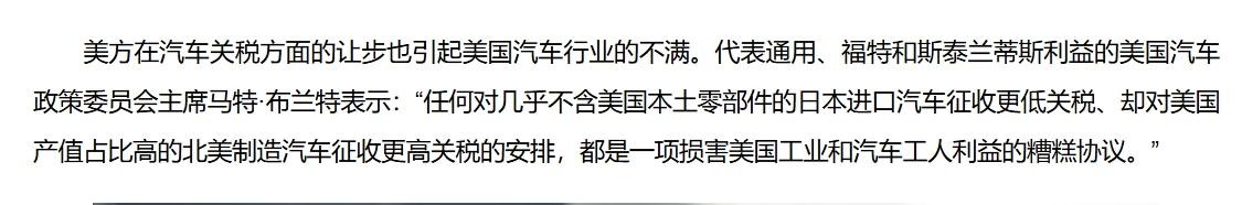 所以美日貿易協議公佈之後,美國3大車企非常不滿,美國汽車政策委員會(AAPC)表示,如果日本進口汽車的關稅被降到15%,而來自加拿大和墨西哥的車輛仍維持在25%,這是對美國本土汽車產業和工人的不利協議。