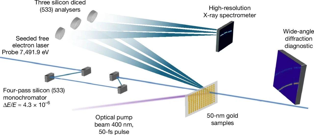 2. “測速”:緊接着,另一束更亮的X射線脈衝(來自LCLS)穿過這片被加熱的金箔。溫度越高,金原子振動得越快。X射線撞上這些狂飆的原子後,就像交警的雷達測速槍一樣,其頻率會發生微小的改變(多普勒效應)。