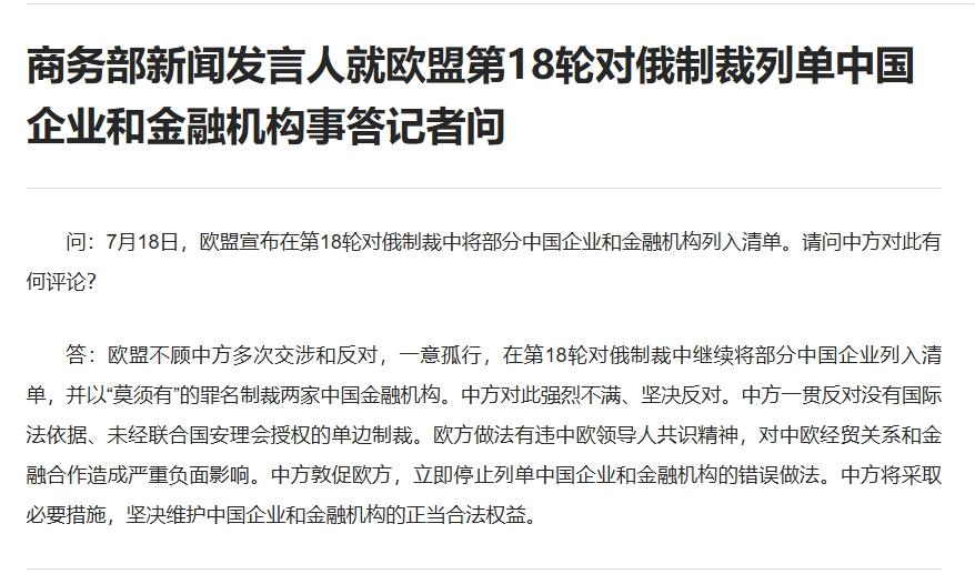 7月18日,歐盟宣佈在第18輪對俄製裁中,將部分中國企業和金融機構列入清單。
