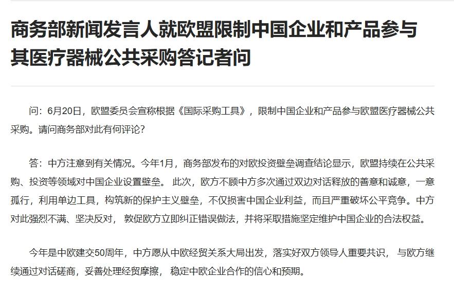 6月16日,馮德萊恩在七國集團峯會期間宣稱中國將稀土主導地位“武器化”;6月24日,歐盟限制中國企業和產品參與歐盟醫療器械公共採購。