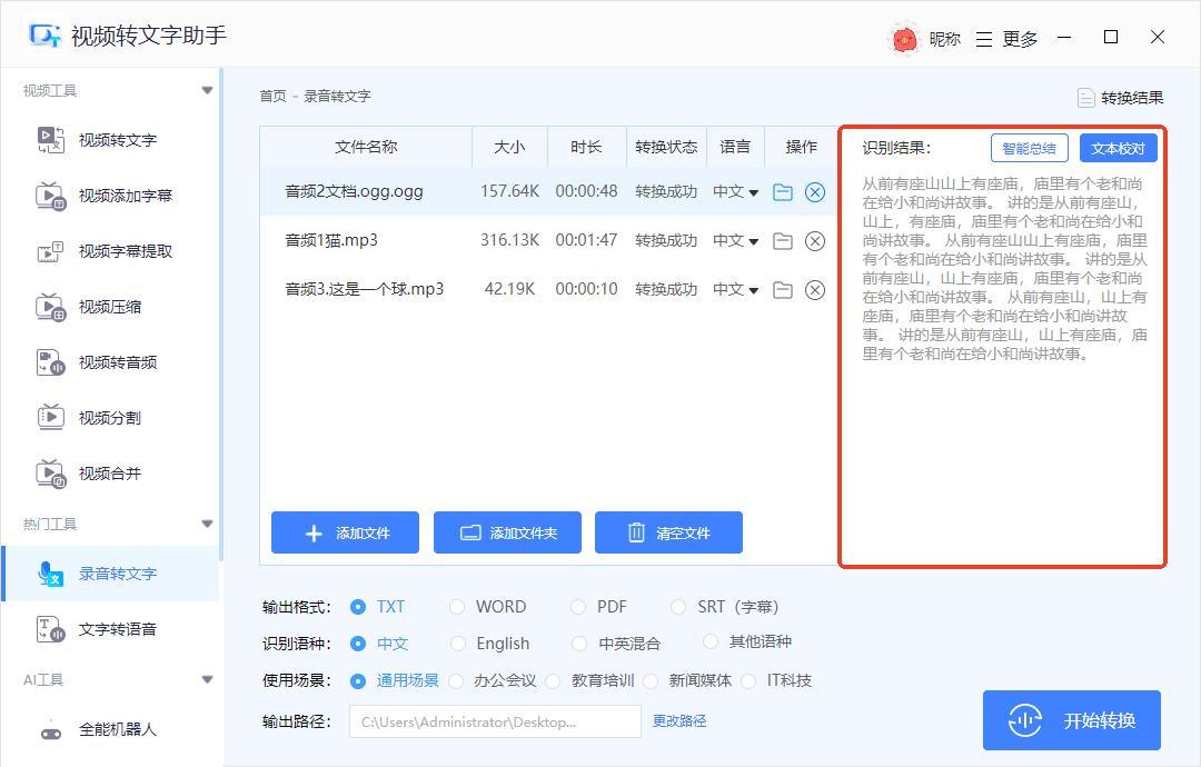 軟件支持批量轉換,可以一次導入多個音頻文件,然後設置輸出格式、識別語種、使用長江和輸出路徑,設置好後點擊右下角的【開始轉換】按鈕。