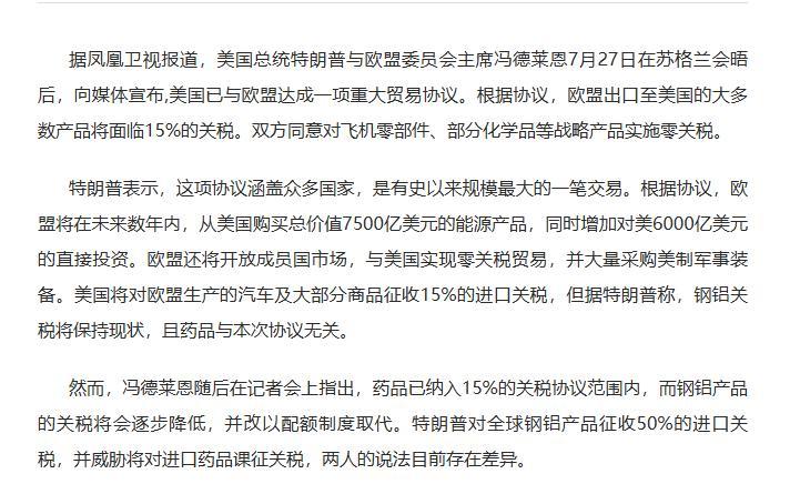 特朗普宣佈,美國與歐盟達成一項重大貿易協議,歐盟承諾在未來數年內,向美國採購價值7500億美元的能源產品,新增6000億美元的對美直接投資, 歐盟還將開放市場,與美國實現零關稅貿易,還要大量購買美國軍事裝備,還要維持鋼鐵和鋁的50%關稅,付出了這麼多代價之後,才換來了15%的關稅。特朗普他真的,他明明可以直接搶的,還把這僞裝成了貿易協議。