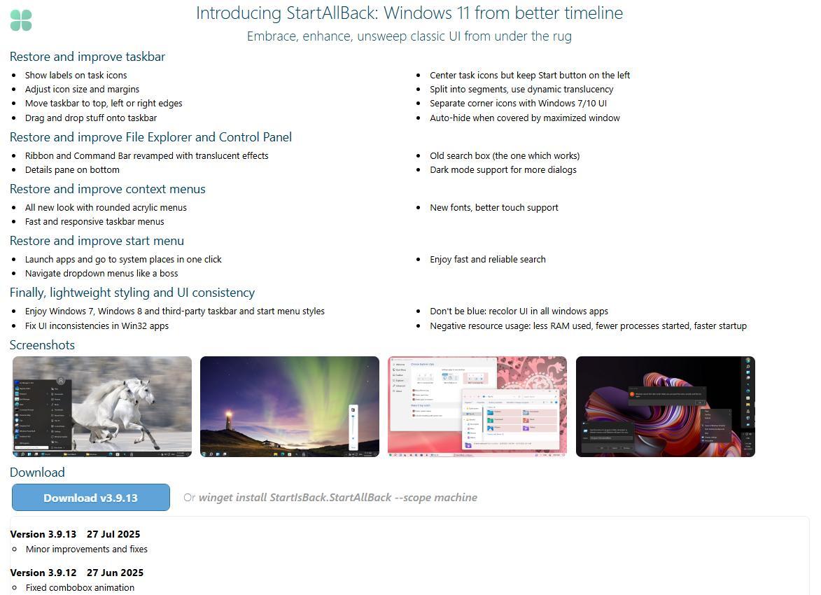 一款專爲Windows 11設計的系統優化工具,可以幫助用戶找回經典操作體驗,支持Win11取消強制合併窗口。軟件可以將開始菜單還原爲Windows 7/10樣式,提供層級菜單結構與自定義圖標大小功能;任務欄可恢復左對齊佈局,支持圖標拖拽、標籤顯示及透明度調節等操作,讓你的任務欄更加符合你的審美。