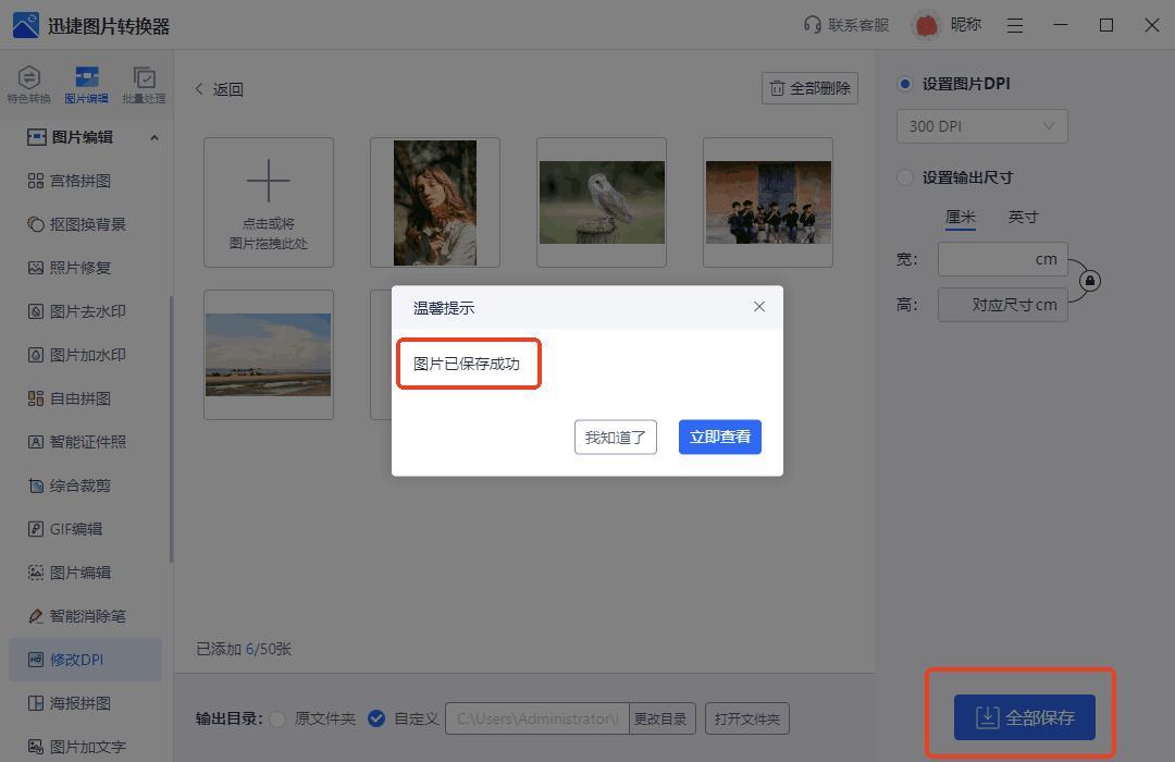 最後點擊右下角的【全部保存】,稍等以後就能顯示保存成功,在指定文件夾中就能找到下載後的300dpi圖片了。