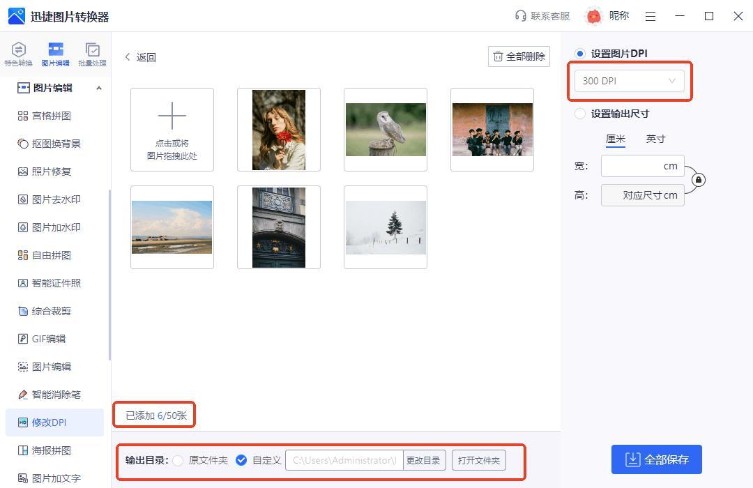 添加好圖片之後,在右上角的【設置圖片dpi】中選擇300dpi,就能爲上傳的圖片設置同樣的dpi。軟件還支持自定義設置輸出目錄,大家可以根據需求設置圖片導出後的指定文件夾。
