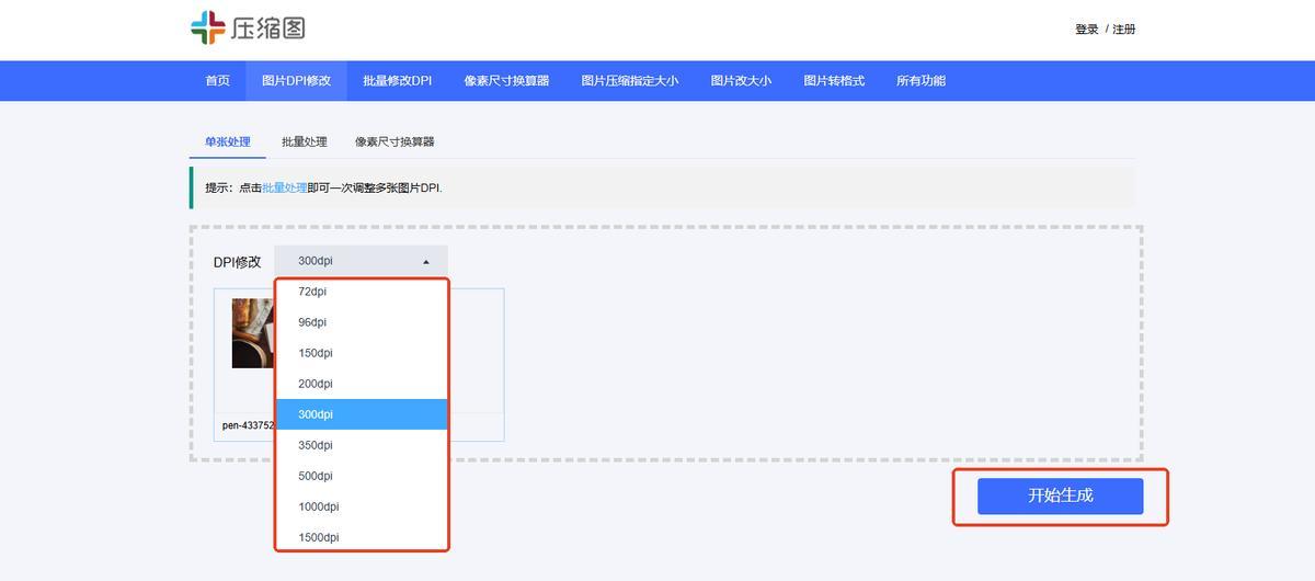 一款便捷的在線圖片處理工具,不僅支持將png、webp等格式轉換成JPG,還可以自定義設置圖片的dpi,操作也不難,點擊【圖片dpi修改】,導入圖片後,點擊【dpi修改】的下拉菜單,選擇300dpi,最後點擊【開始生成】即可。