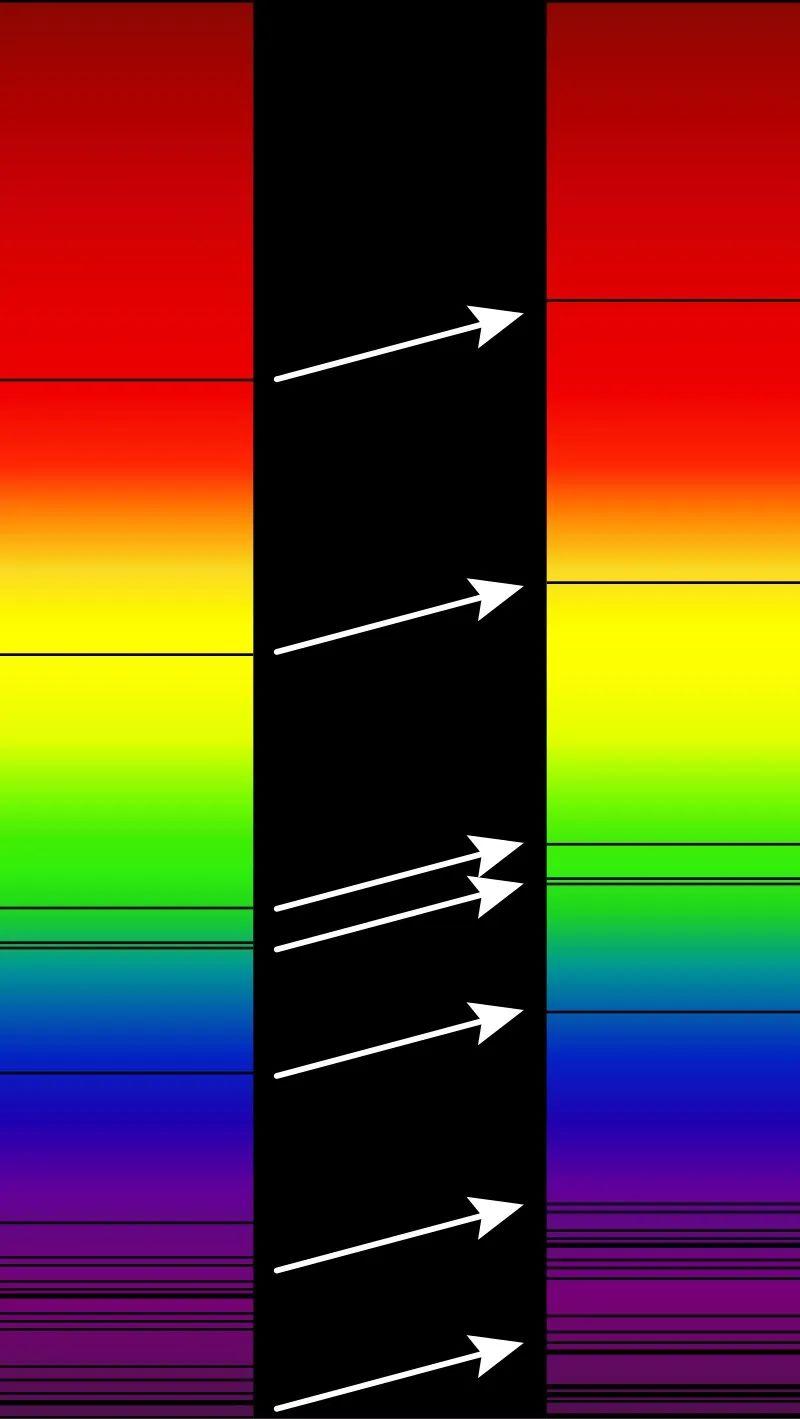上圖右側爲遙遠的星系在可見光波段的光譜,與圖左側太陽的光譜比較,可以看見譜線朝紅色的方向移動