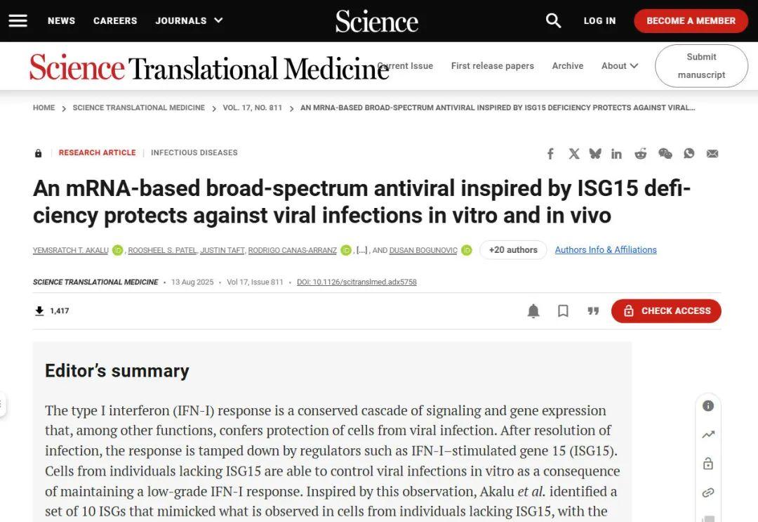 Akalu, Y. T., Patel, R. S., Taft, J., Canas-Arranz, R., ... Bogunovic, D. (2025). An mRNA-based broad-spectrum antiviral inspired by ISG15 deficiency protects against viral infections in vitro and in vivo. Science Translational Medicine, 17(811). DOI: 10.1126/scitranslmed.adx5758