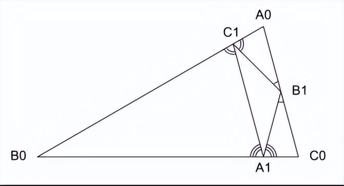 當講到“垂足三角形”迭代並構造其對應的一類我曾參與研究並發表過幾篇學術論文的分形時,我先在黑板上畫上一個銳角三角形,然後從它的每一個頂點作其對邊的垂線,得到的三個垂足構成原先三角形的垂足三角形,將這個三角形拿走(三條邊保留下來),那麼原先的大三角形內剩下三個小三角形,這完成了製造對應分形的無窮次迭代的第一次迭代,之後對每一個剩下的更小三角形如法炮製,直至無窮。爲了獲得最終形成的那個稱之爲“謝爾賓斯基垂足三角形(Sierpiński pedal triangle)”分形的維數性質,需要證明這三個小三角形都與初始選定的大三角形相似。見下圖所示: