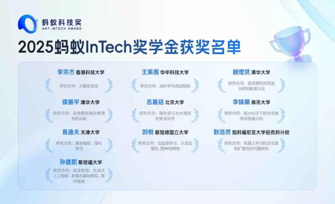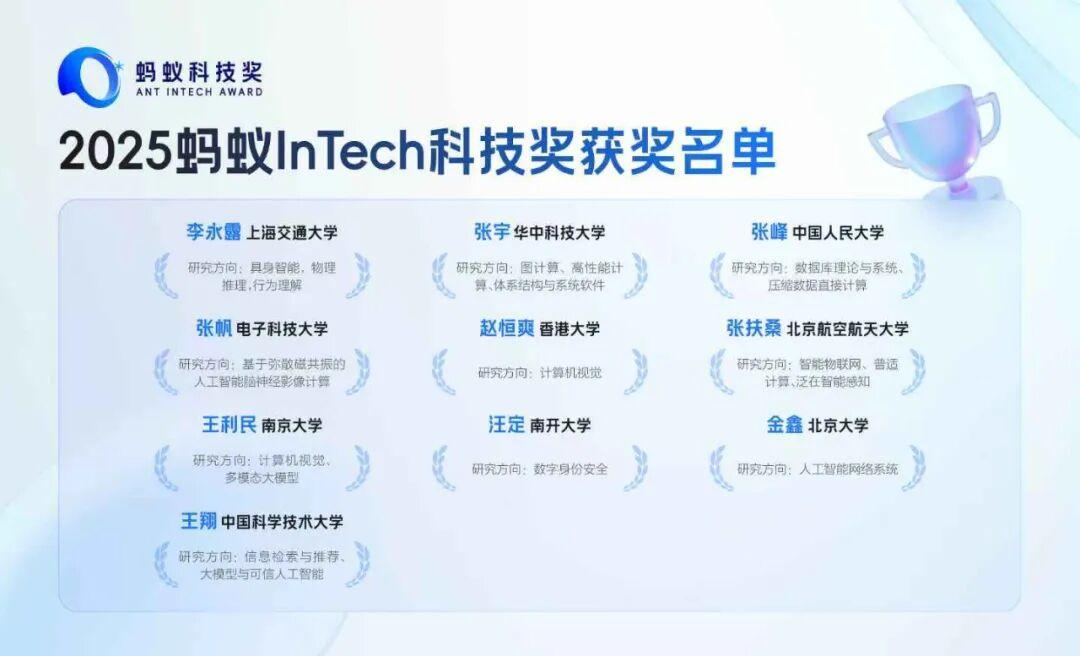 螞蟻InTech的科技獎完全公益化運作,面向在全球高校、科研院所及新型研發機構中全職從事計算機科學研究與實踐的中國青年學者。獎項強調三大導向:理論探索、技術突破、工程實踐,覆蓋通用人工智能、具身智能、數字醫學、數據處理與安全隱私四大方向。