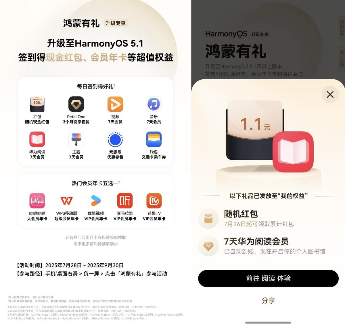 升級鴻蒙5.1後,我還解鎖了隱藏福利:每天在桌面右滑進負一屏,點“鴻蒙有禮”簽到,沒幾天就領到華爲閱讀7天會員!順手的事,不花一分錢,VIP書庫裏的《明朝那些事》《認知覺醒》直接解鎖。以前捨不得買的大部頭,現在通勤時用眼動翻頁沉浸式讀,連等咖啡的 3 分鐘都能踏實啃兩頁,那種 “不花錢還高效” 的快樂,自律黨懂的都懂~