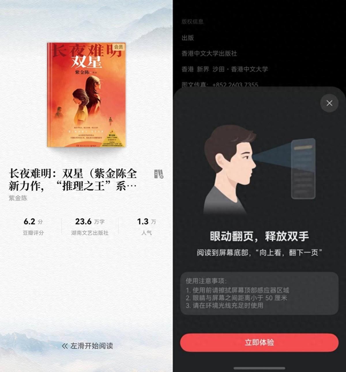 眼動翻頁一開,讀到頁面底部,視線自然往上一抬——啪,下一頁自己來了。後來查了才知道,這功能靠的是前置攝像頭+紅外感應抓眼球動作,AI算法預判我“看完了沒”,比手還懂節奏!現在地鐵里人擠人,我單手抓扶手,書頁跟着眼神自動翻;中午喫飯時,左手拿勺喝湯,右手夾菜,視線掃到頁尾,書頁自己就翻了~而且不管我是坐直、癱着,甚至手機歪着放,它都能穩穩接住我的眼神指令,翻頁從沒掉過鏈子!