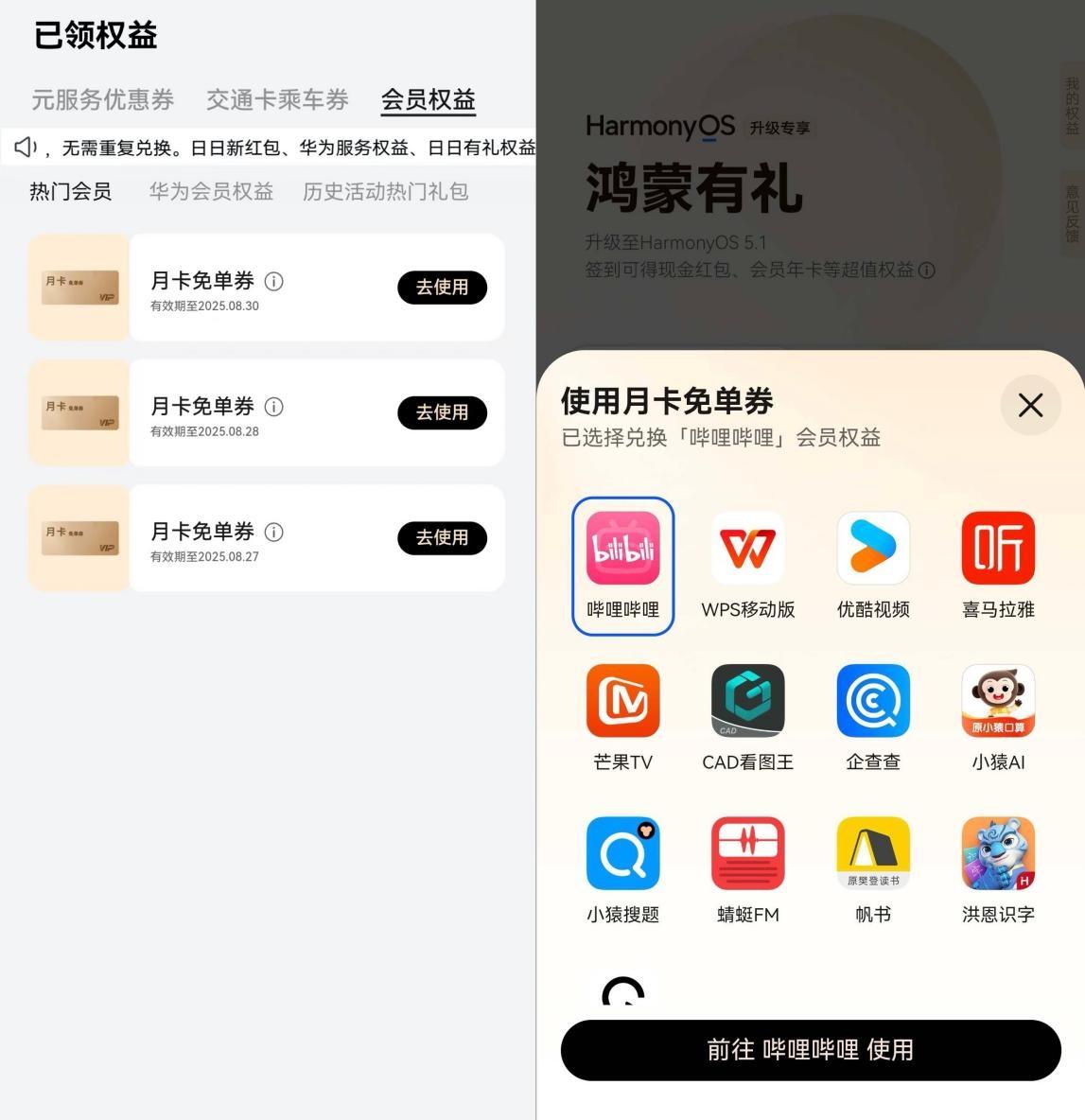 順便一提,這個每日簽到是真能薅!每天都有隨機現金紅包、華爲應用7天會員、熱門應用的月卡免單券,還有交通券,每天跟攢雞蛋一樣,我現在都有點愛上這種感覺了!就等着簽完30天領個年卡,嗶哩嗶哩、優酷、芒果、WPS、喜馬拉雅都能選,很超值!