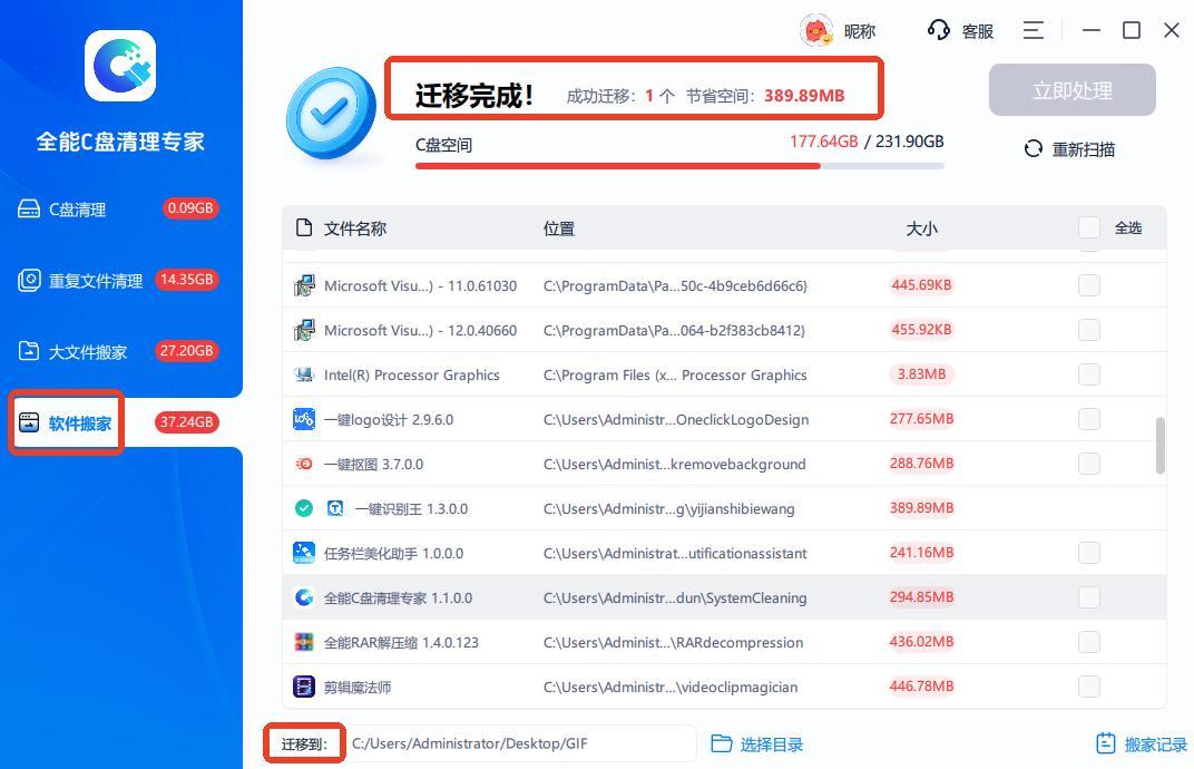 如果你覺得C盤空間仍然不夠多,那麼可以在【軟件搬家】中勾選可遷移到其他盤中的軟件,只需要設置遷移後的目錄,點擊【立即處理】,就能快速遷移成功,還會顯示釋放的C盤空間。