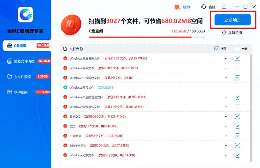 打開軟件,在首頁找到【C盤清理】,勾選【推薦】,軟件推薦刪除的內容都是可刪除的垃圾文件。